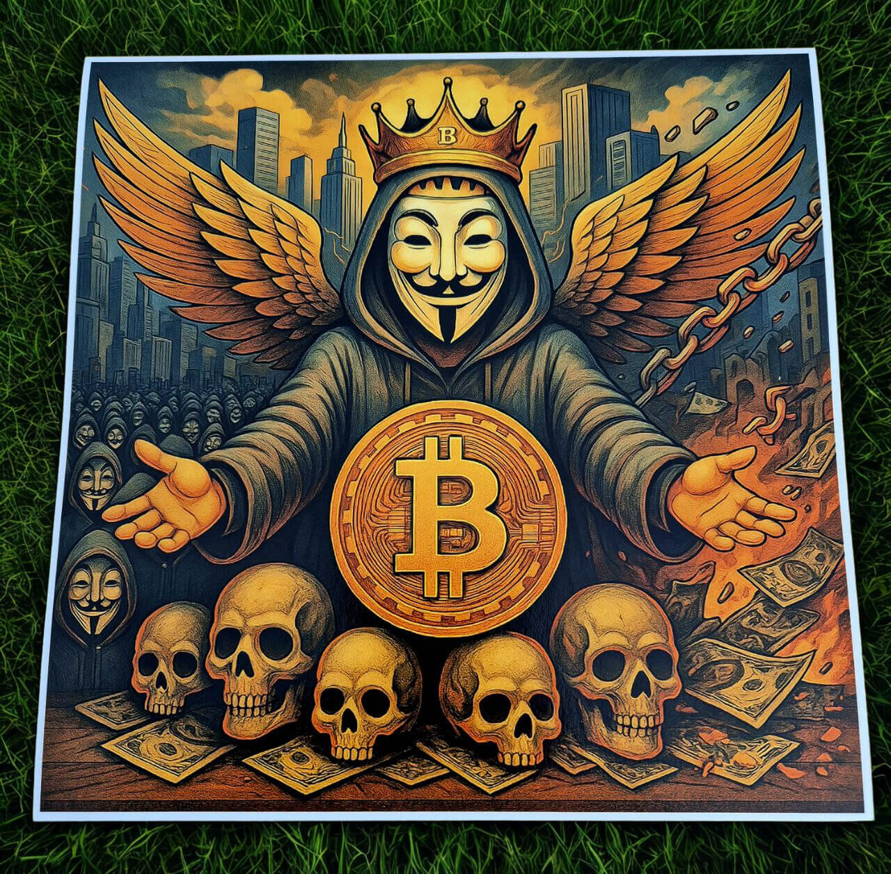 It tells the entire journey of Bitcoin: the awakening of the people against a corrupt financial system, the collapse of fiat symbolized by skulls over burning bills, the breaking of chains through decentralization, the wings of evolution, and finally the crowning of Bitcoin as the new global monetary standard.